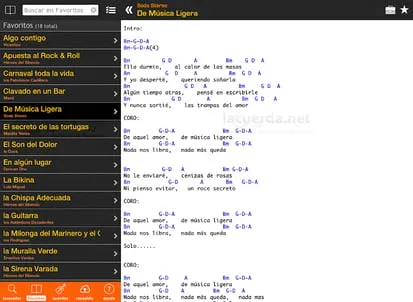 Get direct access to the largest collection of tabs & chords for guitar in Spanish: LaCuerda.net. Through our app, you will get access to over 100,000 songs from your favorite artists in Spain, US and Latin America. Our app has been optimized from smarthphones and tablets. It includes some cool features such as:- Off-Line access: access your favorite songs even in Airplane mode.- Remote Backup: you can store and retrieve your favorites list from our servers.- Chord diagrams (for guitar and piano)- Chord translation: adapt the tone of the song to your voice or switch beteen Do,Re,Mi and C,D,E.- Auto-scroll- Share buttons (email, Facebook, Twitter)- Print! (using Google Cloud Print)Don't wait anymore and install it today. You'll rock that fiesta!
