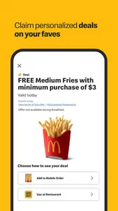 Get the app now to join MyMcDonald's Rewards and start earning points on your faves for free McDonald's. Plus, get exclusive deals and save time by ordering ahead in the app.* Mobile Order & Pay Get your faves fast with Mobile Order and Pay. Place your order and select your pickup option.* MyMcDonald’s Rewards Join MyMcDonald's Rewards in the app to start earning points on every purchase and redeem for free McDonald’s.* Exclusive Deals and App Offers Get exclusive deals on your McDonald’s favorites in the app with contactless Mobile Order & Pay* and convenient Drive Thru or Curbside pickup. McDelivery Now get your faves delivered, earn MyMcDonald’s Rewards points and track your order all with McDelivery in the app. Save Your Favorites No pickles? No problem. Customize and save your favorites to quickly reorder for your next visit. Restaurant Locator Open the map and find the nearest McDonald’s, along with store hours, and restaurant information. Download the McDonald’s app today and enjoy access to exclusive deals, MyMcDonald’s Rewards and much more. *McDelivery prices may be higher than at restaurants. Download and registration required. Data rates may apply. The McDonald's App is not currently compatible with smartwatches.